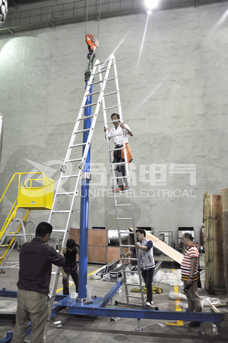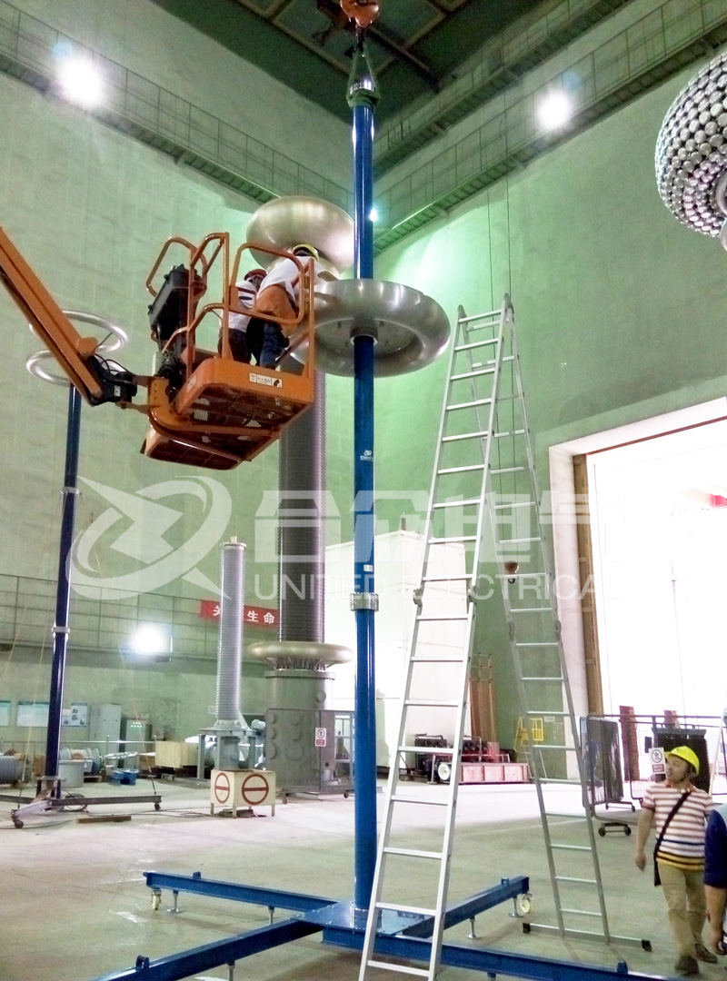 在現場,武漢合眾電氣的技術人員開始對這臺電容分壓器進行組裝。由于這臺分壓器的高壓電壓達1200KV,所以整套設備非常巨大。