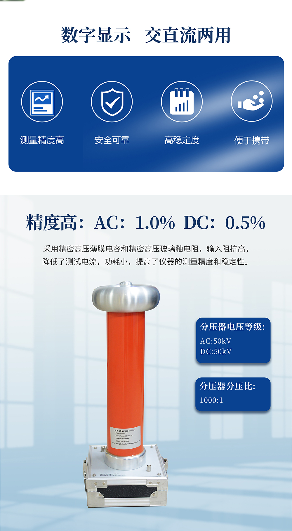 采用精密高壓薄膜電容和精密高壓玻璃釉電阻,輸入阻抗高,降低了測試電流,功耗小,提高了儀器的測量精度和穩定性;信號處理部分,采用高性能OP進行信號放大,運用新雙積分式AD采樣技術,四位半液晶顯示,高分辨力達到0.001kV,是高壓靜電電壓表的更新換代產品。