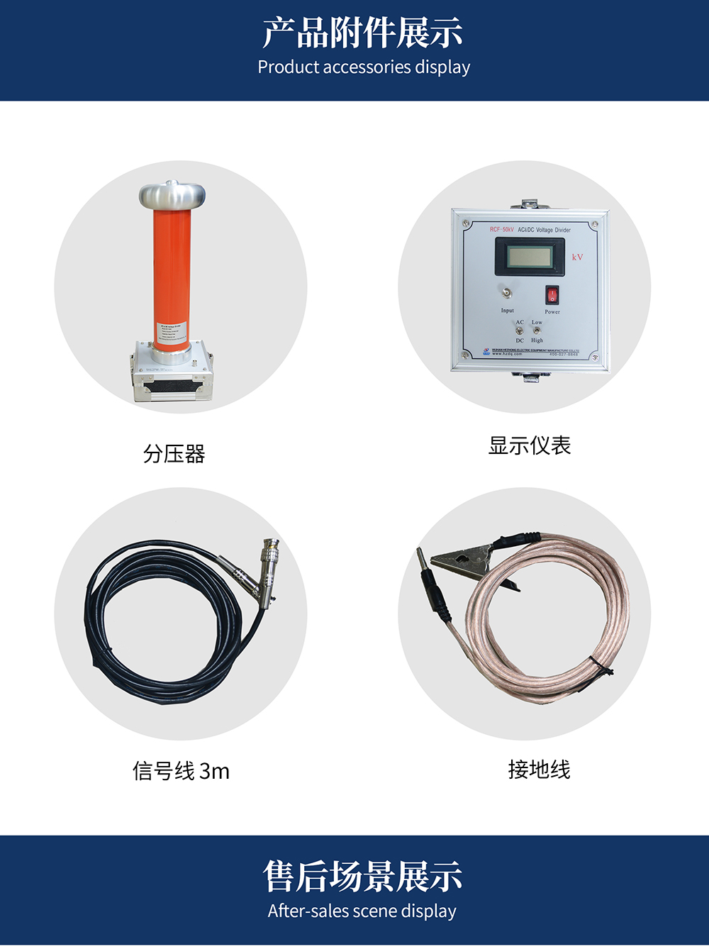 本產品作為高電壓測量之理想設備,主要用于電力系統及電氣電子設備制造部門測量工頻交流高電壓和直流高電壓。本儀器由高壓分壓器和低壓顯示表兩部分組成,兩者采用配套電纜連接使用。