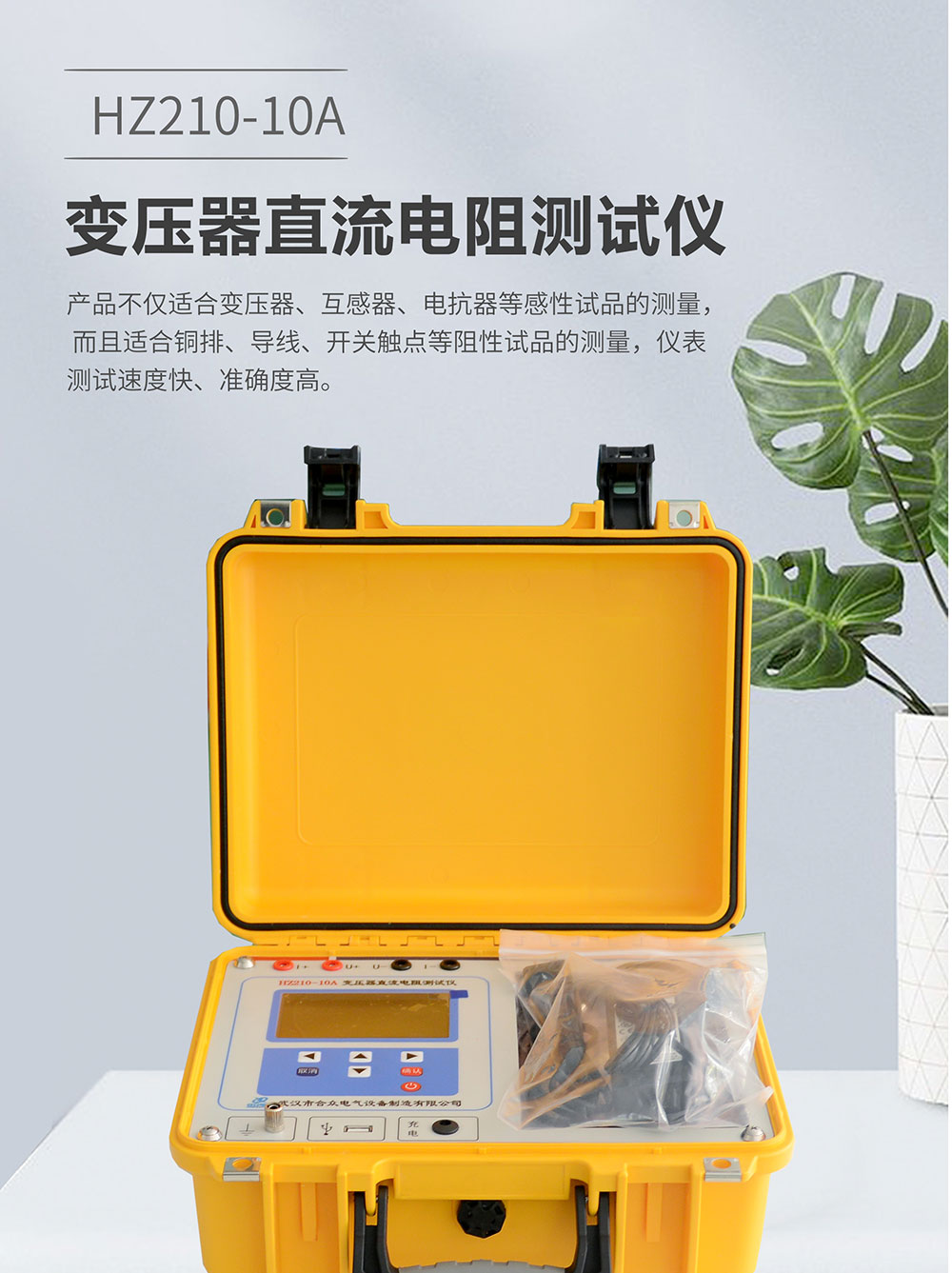 直流電阻測試儀 HZ210-10A 變壓器直流電阻測試儀是一款創新型產品,內置大容量鋰電池,儀器與測試線采用機線一體設計,產品體積小巧,便于攜帶。產品不僅適合變壓器、互感器、電抗器等感性試品的測量,而且適合銅排、導線、開關觸點等阻性試品的測量,儀表測試速度快、準確度高。