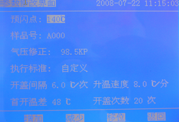 1)在此界面中預(yù)閃點、樣品號、氣壓、標準和時間,都可按提示進行調(diào)整,修改完成后按【返回】鍵。回到主操作界面。
