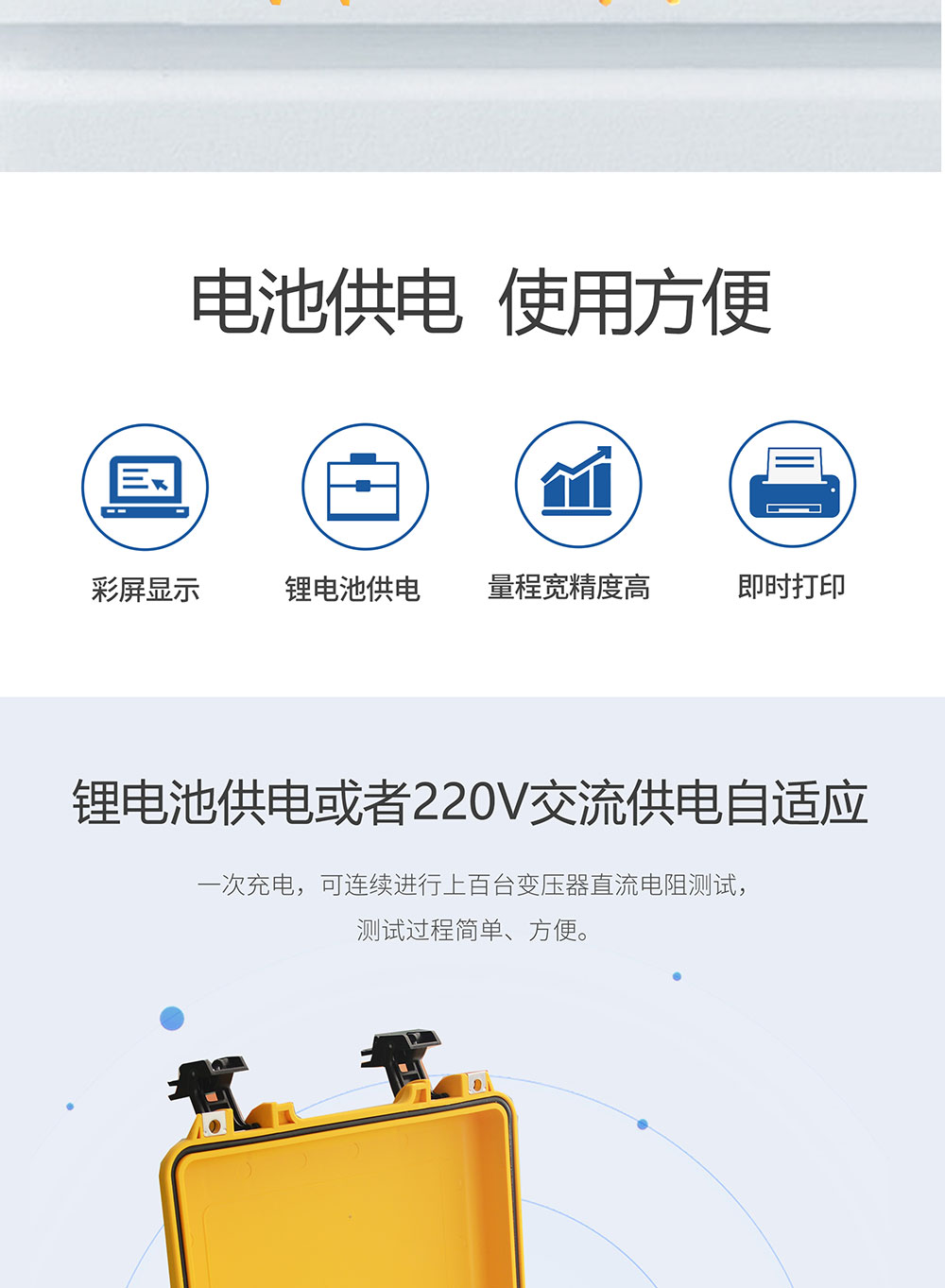 1、鋰電池供電或者220V交流供電自適應(yīng),一次充電,可連續(xù)進(jìn)行上百臺(tái)變壓器直流電阻測試,測試過程簡單、方便。