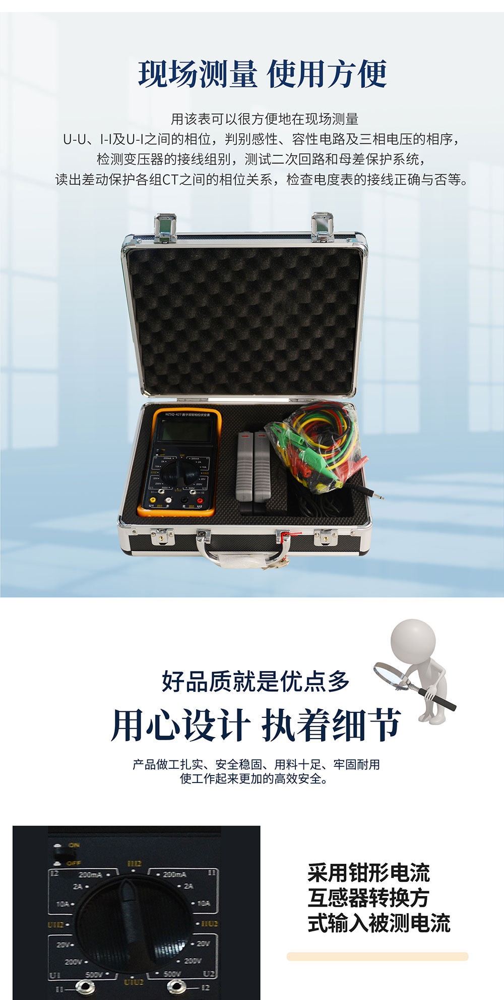 HZSQ-427數(shù)字雙鉗相位伏安表,是專(zhuān)為現(xiàn)場(chǎng)測(cè)量電壓、電流及相位而設(shè)計(jì)的一種高精度、低價(jià)位、手持式、雙通道輸入測(cè)量?jī)x表。用該表可以很方便地在現(xiàn)場(chǎng)測(cè)量U-U、I-I及U-I之間的相位,判別感性、容性電路及三相電壓的相序,檢測(cè)變壓器的接線組別,測(cè)試二次回路和母差保護(hù)系統(tǒng),讀出差動(dòng)保護(hù)各組CT之間的相位關(guān)系,檢查電度表的接線正確與否等。采用鉗形電流互感器轉(zhuǎn)換方式輸入被測(cè)電流,因而測(cè)量時(shí)無(wú)需斷開(kāi)被測(cè)線路。測(cè)量U1-U2之間相位時(shí),兩輸入回路完全絕緣隔離,因此完全避免了可能出現(xiàn)的誤接線造成的被測(cè)線路短路、以致燒毀測(cè)量?jī)x表。顯示器采用了高反差液晶顯示屏,字高達(dá)25mm,屏幕角度可自由轉(zhuǎn)換約70°,以獲得更佳視覺(jué)效果。數(shù)字雙鉗相位伏安表外殼采用工程絕緣材料,另配橡皮防振保護(hù)套,安全、可靠。執(zhí)行標(biāo)準(zhǔn):JJG440-2008。