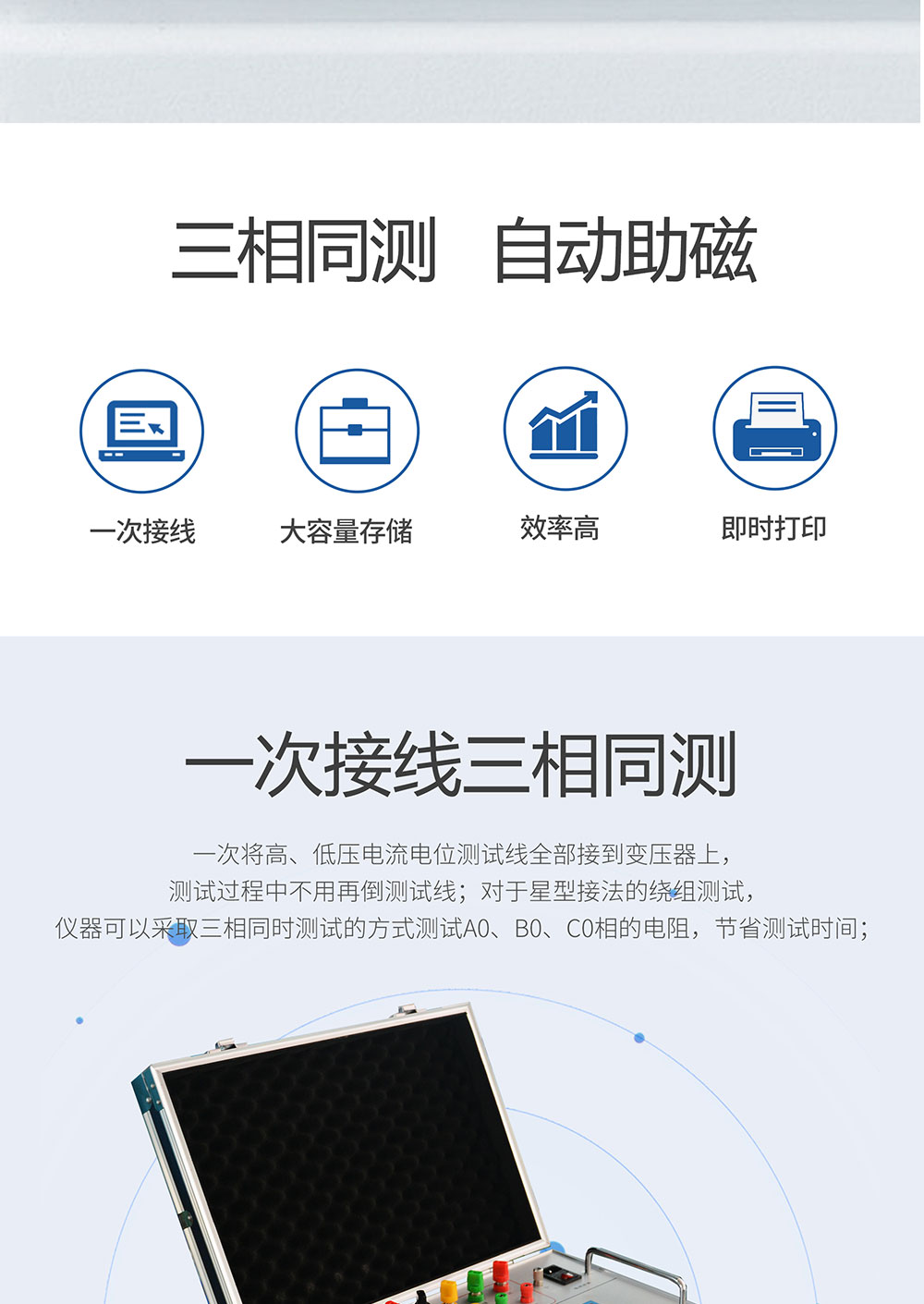 3、三相五柱低壓內部角接的變壓器低壓測試時,儀器內部采用自動助磁的方法,比直接用大電流測試速度快;