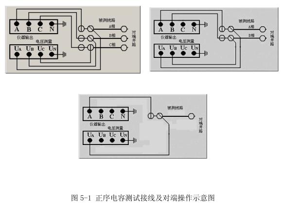 在正序電容(正序開路)測(cè)試中,被測(cè)線路對(duì)端(相對(duì)于測(cè)量端)開路,將儀器電源輸出引至被測(cè)線路測(cè)量端外側(cè)電流引下線,電壓測(cè)量輸入端接至電壓引下線,三相、兩相、單相回路的測(cè)試接線如圖5-1所示。